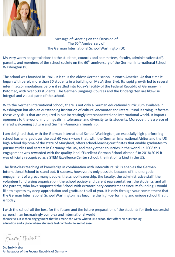 The German Embassy and I are pleased that the Federal Republic of Germany supports the German International School Washington D.C. and value our continued close and faithful cooperation. By working together, we are making an important contribution to the cultural relations and education policy of the Federal Republic of Germany.