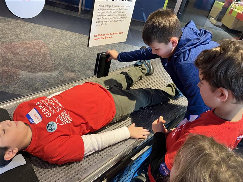 Im Anschluss erkundeten die Kinder das Science Center in Kleingruppen. Dabei gab es viel zu entdecken: Von Dinosaurierknochen über ein Nagelbett bis hin zu Stationen zum Messen von Stärke sowie zum Erkunden von Strom und Elektrizität war für alle etwas dabei.